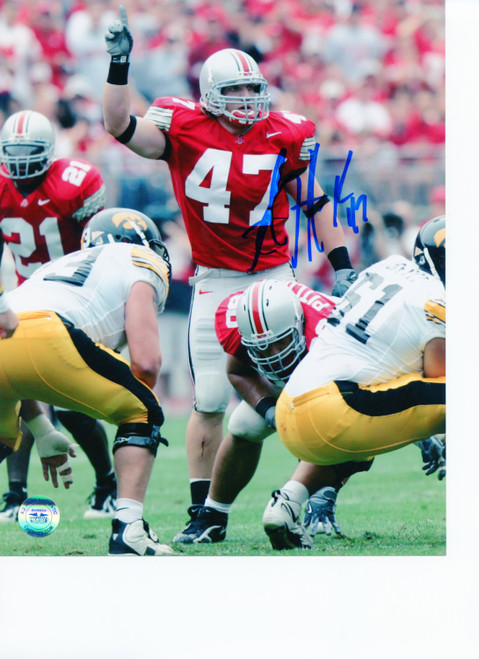 AJ Hawk autographed photos are a must have for any Ohio State Buckeyes man cave, home or office. This 8x10 photo has been authenticated by Seller and comes complete with a Certificate of Authenticity (COA) and tamper-evident sticker. The unique Certificate Number can be verified online. This glossy 8x10 photo ships securely in an 8x10 plastic toploader for protection. Relive the moments in Ohio State Buckeyes history with an iconic shot signed by AJ Hawk. Shop with confidence as this AJ Hawk signature is 100% authentic and backed by Prime One Sports 100% Money Back Guarantee. Prime One Sports is your one stop shop for certified AJ Hawk and Ohio State Buckeyes signed sports memorabilia. Items ships same day.