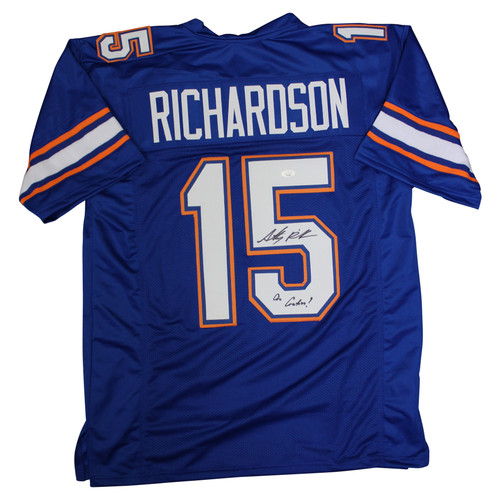 This Anthony Richardson Autographed Florida Gators Custom Blue #15 Jersey with "Go Gators" Inscription - JSA Authentic is an Excellent Piece of Sports Memorabilia for any Anthony Richardson Fan or Collector in Your Life! Shop with Confidence knowing your Anthony Richardson Autograph is Authenticated by JSA and the Certificate of Authenticity is Included with Your Purchase! Items Ship Quickly and Securely!