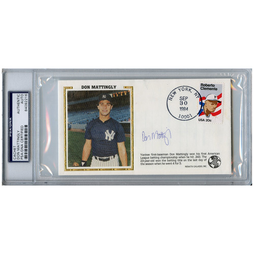 This is a First Day Cover that has been hand signed by the great, Don Mattingly. The cachet has been authenticated and slabbed by PSA/DNA. The serial number is verifiable online using PSA/DNA #84092216. The cover comes encapsulated in a tamper-proof cover. 100% authentic signature from New York Yankees legend, Don Mattingly. A great gift idea for a New York Yankees or MLB collector.