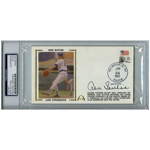 This is a First Day Cover that has been hand signed by the great, Don Sutton. The cachet has been authenticated and slabbed by PSA/DNA. The serial number is verifiable online using PSA/DNA #84092197. The cover comes encapsulated in a tamper-proof cover. 100% authentic signature from Milwaukee Brewers legend, Don Sutton. A great gift idea for a Milwaukee Brewers or MLB collector.