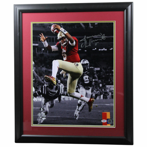 This Jameis Winston Autographed Florida State Seminoles Framed Jumping into Endzone Spotlight 16x20 Photo Signed in Silver with Name Plate - PSA/DNA Authentic is an Excellent Piece of Sports Memorabilia for any Jameis Winston Fan or Collector in Your Life! Shop with Confidence knowing your Jameis Winston Autographed Framed Photo is Authenticated by PSA/DNA and the Certificate of Authenticity Included with Your Purchase! This Jameis Winston Florida State Seminoles Autographed Framed Photo Measures 23x1x27 and would Look Amazing in any Fan-Cave or Sports Room! Items Ship Quickly and Securely!