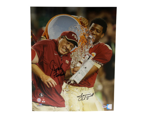 Jimbo Fisher Jameis Winston Florida State Seminoles Autographed 16x20 Photo has been authenticated by PSA/DNA and ships complete with a tamper-proof sticker and matching Certificate of Authenticity. The certification number can be verified online. 16x20 photographs ship securely in a plastic 16x20 toploader to avoid dings and scratches. Jimbo Fisher Jameis Winston hand signed this glossy 16 x 20 photograph. Relive the best moments in Florida State Seminoles history with an autographed collectible from star player, Jimbo Fisher Jameis Winston. Step up your Florida State Seminoles man cave with this authentic signed photograph. Purchase this autographed picture with confidence as it is backed by Prime One Sports 100% money back guarantee.