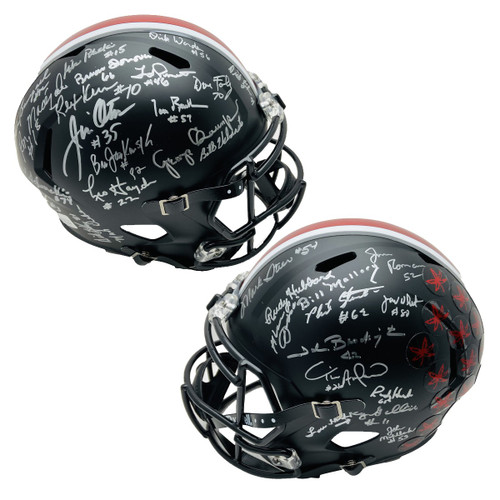 This Ohio State Buckeyes 1968 National Championship Team Signed Riddell Black OSU Full Size Speed Replica Helmet - Certified Authentic is an Excellent Piece of Sports Memorabilia for any Rex Kern Fan or Collector in Your Life! Signed by 1968 National Champion Legends such as: Rex Kern, Lou Holtz, Jim Otis, Leo Hayden, John Brockington, Mike Sensibaugh, Tim Anderson, and many more Buckeye Greats! Shop with Confidence knowing your Rex Kern Autograph is Authenticated by Seller and the Certificate of Authenticity Included with Your Purchase! Items Ship Quickly and Securely!