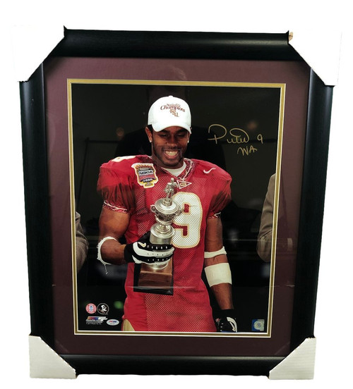 This Peter Warrick Autographed Florida State Seminoles Framed Holding Sugar Bowl MVP Trophy 16x20 Photo - PSA/DNA Authentic is an Excellent Piece of Sports Memorabilia for any Peter Warrick Fan or Collector in Your Life! Shop with Confidence knowing your Peter Warrick Autograph is Authenticated by PSA/DNA and the Certificate of Authenticity is Included with Your Purchase! Items Ship Quickly and Securely!