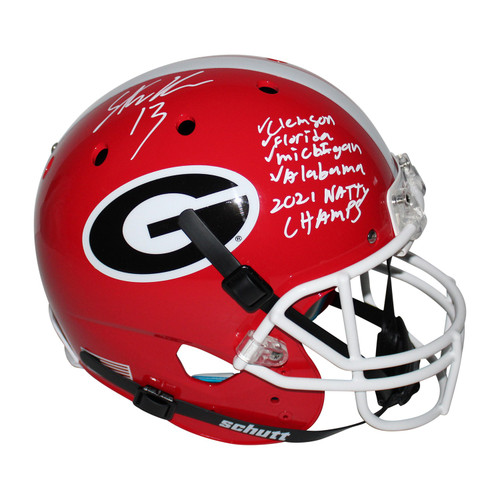 This Stetson Bennett IV Autographed Georgia Bulldogs Schutt Full Size Replica with Schedule Checklist Inscriptions - Beckett QR Authentic is an Excellent Piece of Georgia Bulldogs Sports Memorabilia for any Stetson Bennett IV Fan or Collector in Your Life! Signed by the Georgia Bulldogs National Champions at our Signing in Lawrenceville GA. Shop with Confidence knowing your Stetson Bennett IV Autograph is Authenticated by BAS and the Certificate of Authenticity is Included with Your Purchase! Items Ship Quickly and Securely!